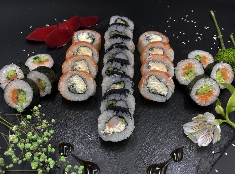 1. рис, нори, сыр, огурец, лосось 2. рис, нори, сыр, огурец, лосось 3. рис, нори, сыр, огурец, креветка, тобико