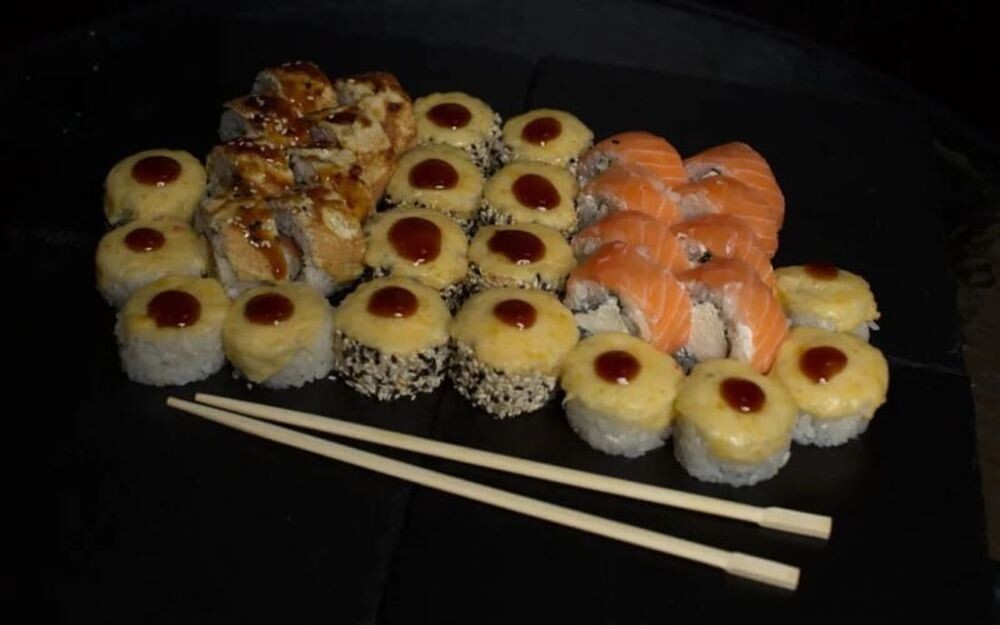 4. Запеченный ролл: рис, сыр, краб микс, помидор, сырная шапочка