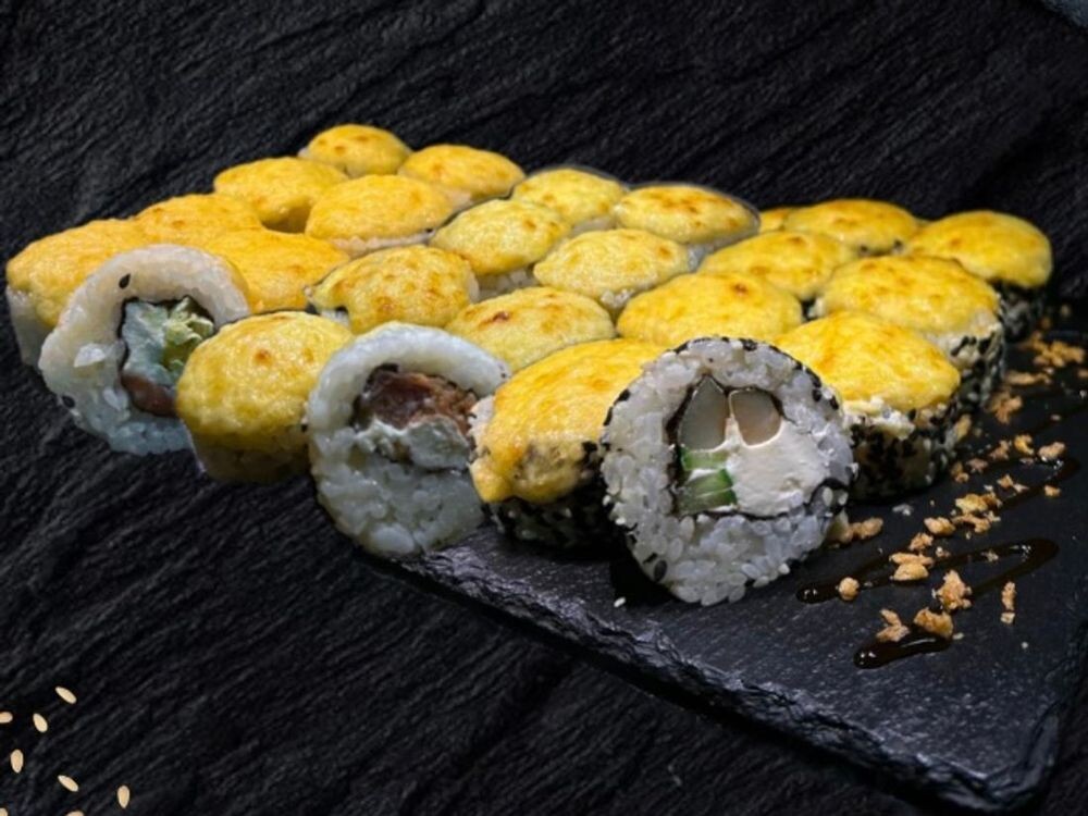 1. Запеченный ролл: рис, сыр, масляная рыба, перец, стружка тунца, сырная шапочка 2. Запеченный ролл: рис, лосось, салат айсберг, тобика, сырная шапочка 3. Запеченный ролл: рис, сыр, лосось терияки, такуан, помидор, сырная шапочка