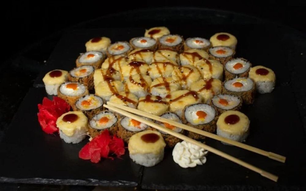 5. Запеченный ролл: рис, креветки, блин тамаго, помидор, огурец, сырная шапочка